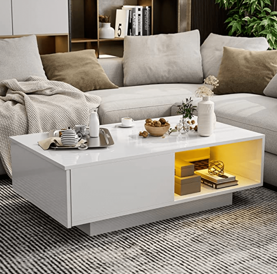 【High Gloss & Sturdy】-LED coffee table is simple and high-gloss design, with spacious tabletop area adds extra elegance and modern sense for your living room, simple structure and stylish texture will highlight your office or home decor. it will make it appear more advanced than similar products. Made of particle board and MDF, with a hard appearance ensure the LED coffee table not easy to wear, sturdy and durable, and has a long life.